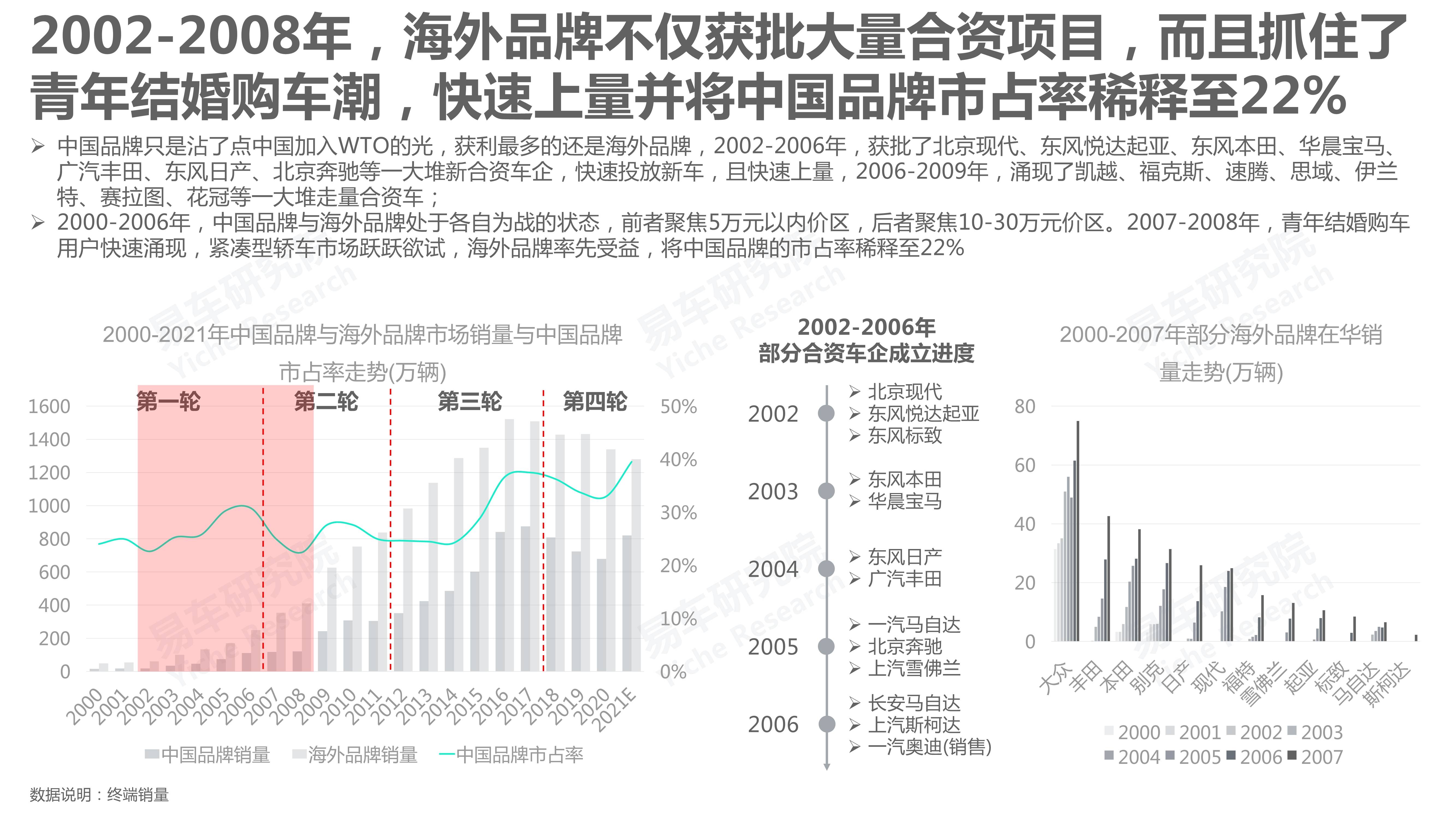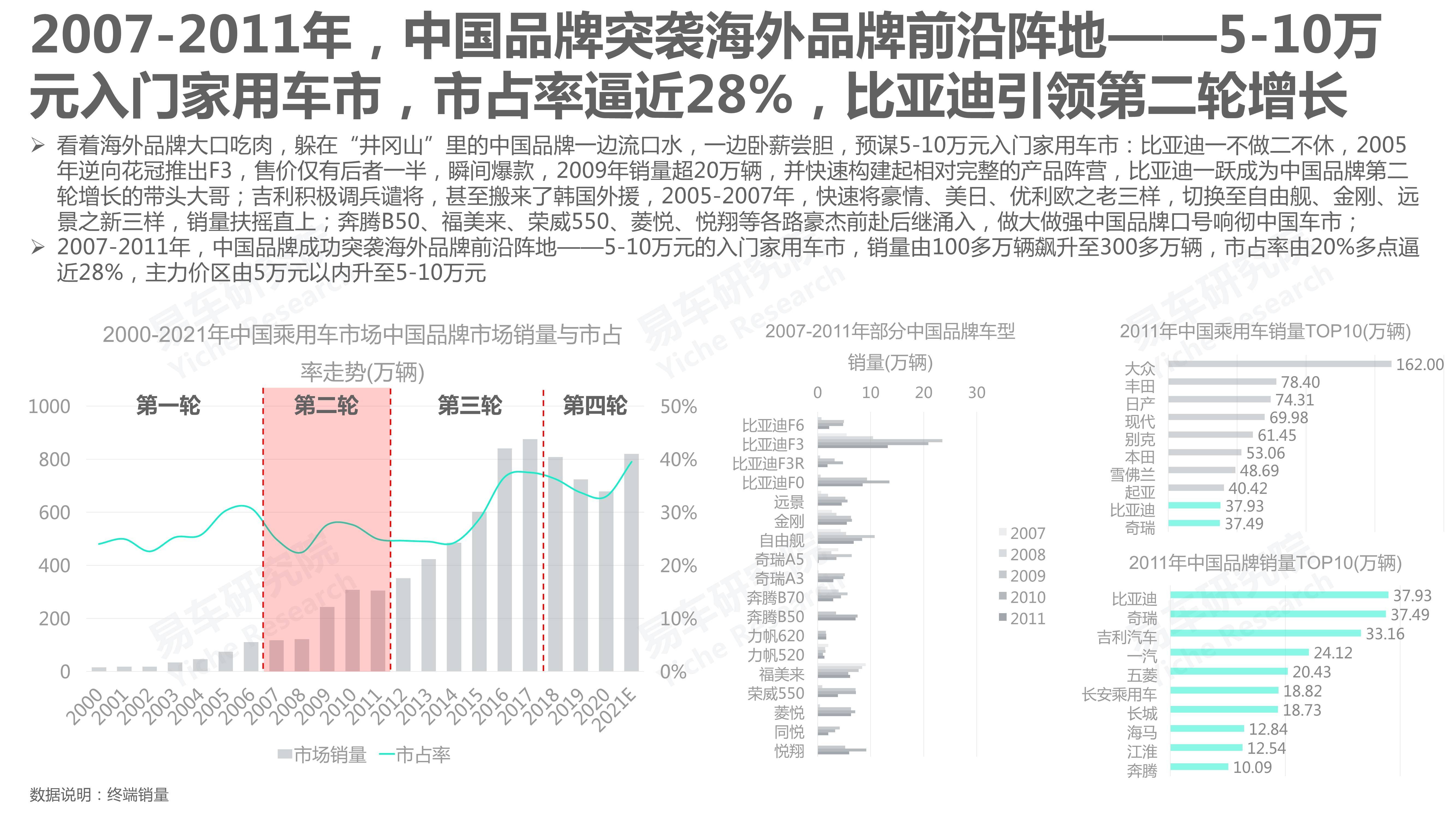 2018-2020年,青年首购用户的大幅减少等,导致中国品牌与海外品牌双双遭遇销量大幅下滑的严峻挑战。其中中国品牌下滑幅度更大,直接跌破700万辆。但2021年,中国品牌率先触底反弹,销量突破800万辆,市占率突破40%,期间海外品牌持续下滑。2022年,中国品牌市占率能否持续扩大并突破50%?销量能否持续提升并突破1000万辆?2023-2025年,海外品牌会如何积极调整,中国品牌该如何积极应对?本报告基于上述思考,进行了简单梳理与探究,不足之处大家多指点与批评。