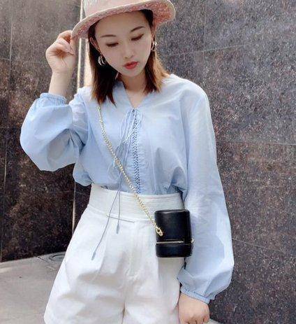 这位小姐姐所穿的这身衣服是一种比较时尚的造型样式,其实今年非常流行这样的打扮,这是一种非常简单而高贵的气质造型,在上面加入了一个浅蓝色的衬衣,而且这件衬衣在设计上非常的大方,采用了尖领的设计,而且在领子上又加入了几个系带作为装饰品,好像是一个蝴蝶结一样,印在了脖子以下,而且在胸部中间加入了蕾丝的样式,让整个人看上去非常有质感,其实这种简单的衣服穿在身上会显得人很青春靓丽,就算是年龄稍微偏大一点的人也可以完美驾驭。